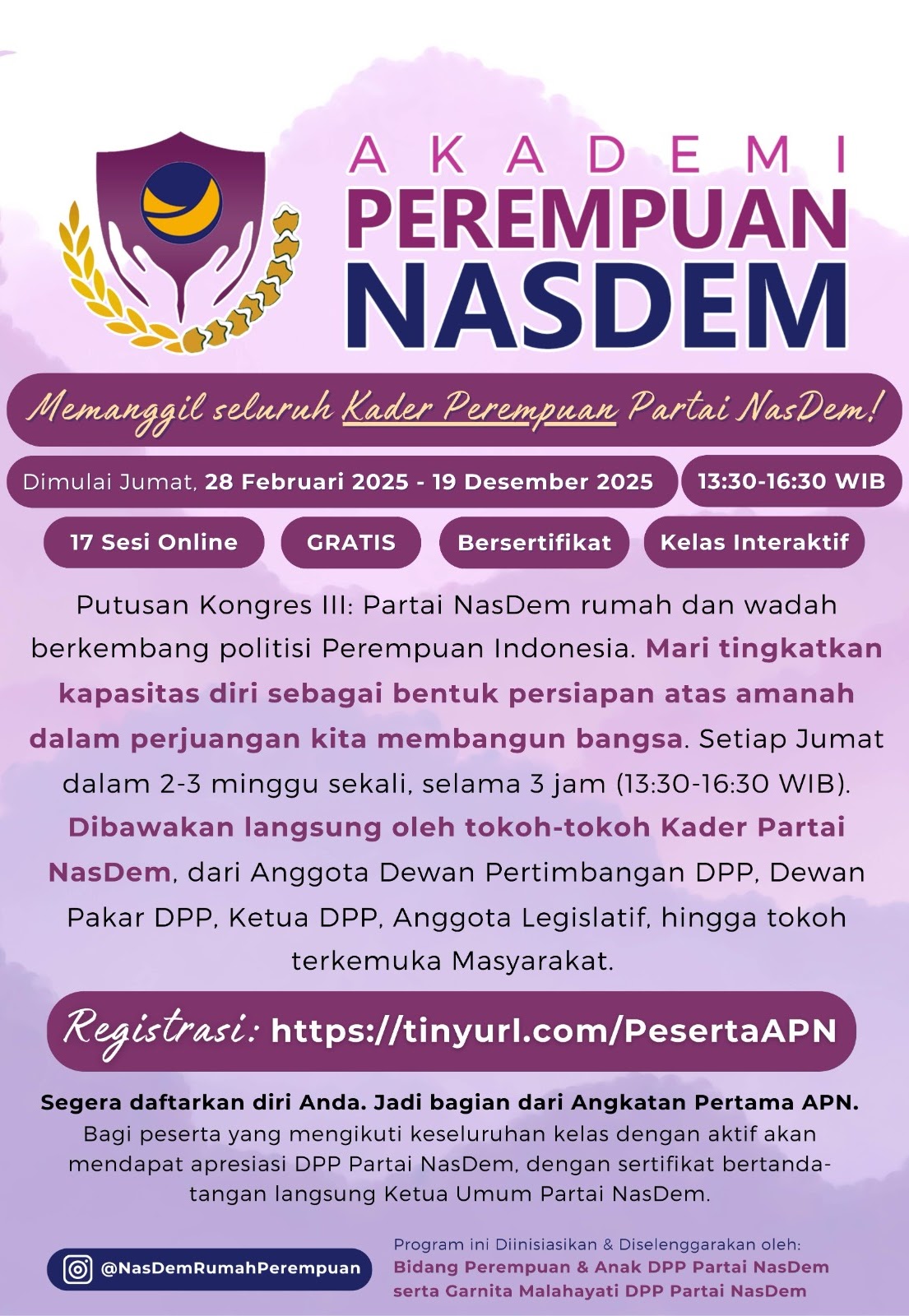 Tempat : Auditorium lt.6, NasDem Tower Jl. R.P. Soeroso No. 42-46 Gondangdia, Menteng, Jakarta Pusat
